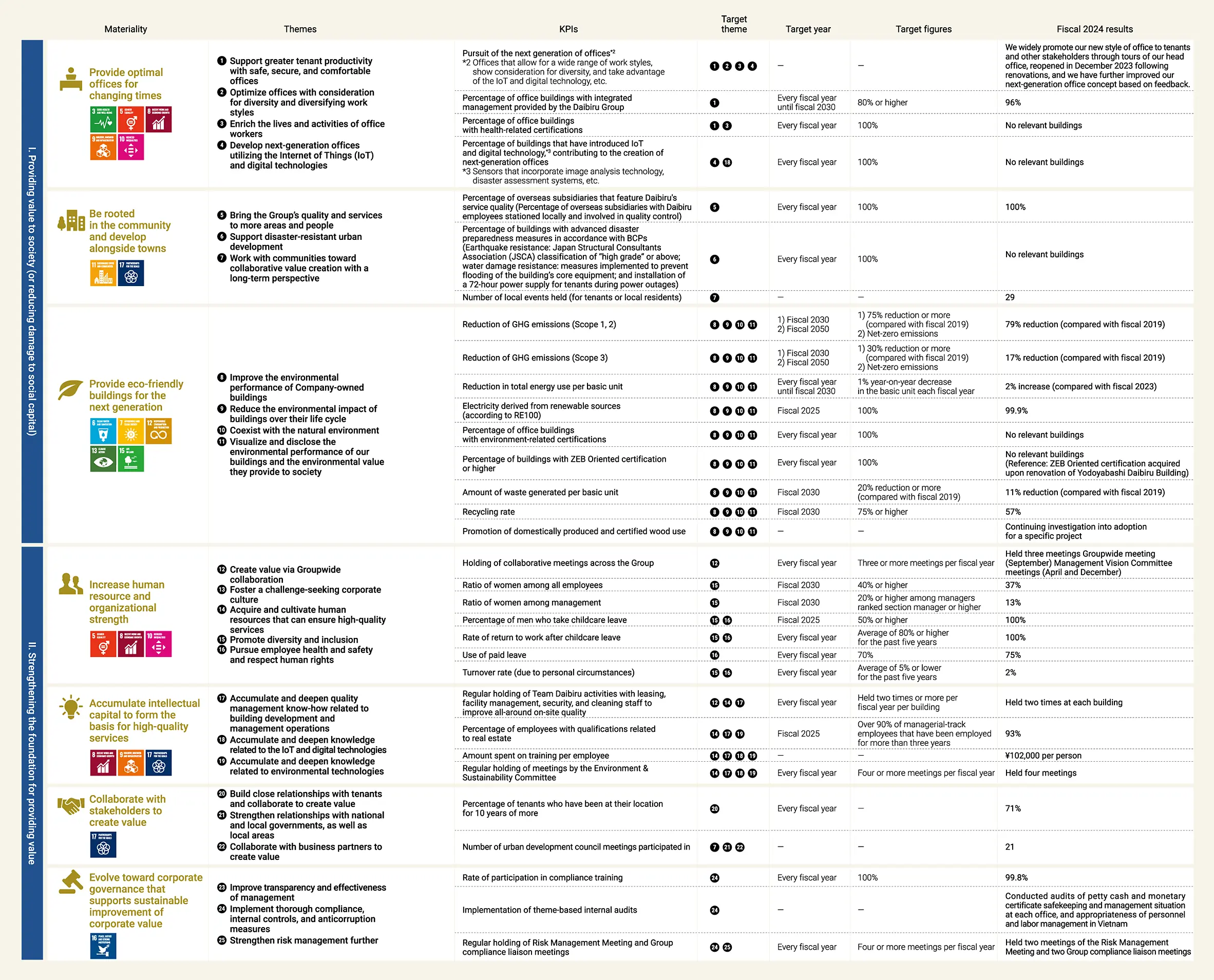 To grow alongside society and assess the range of issues it faces from a business perspective, the Daibiru Group identified material issues in the short, medium, and long term that are either business opportunities or risks, which constitute the Daibiru Group's materiality in 2021. Group materiality comprises two categories: (Ⅰ) providing value to society (or reducing damage to social capital) and (Ⅱ) strengthening the foundation for providing value. The three materialities within category Ⅰ correspond roughly to our corporate principles,"constructing buildings, creating towns, pioneering the new area," in that the first materiality concerns office buildings, the second concerns local communities, and the third involves consideration for the environment.